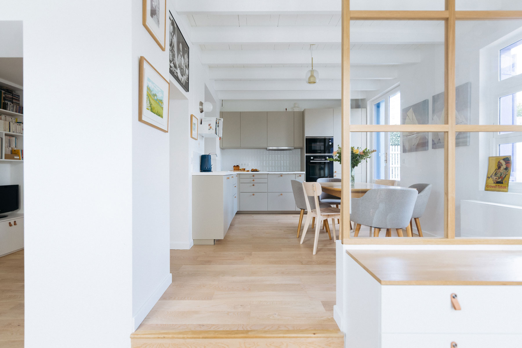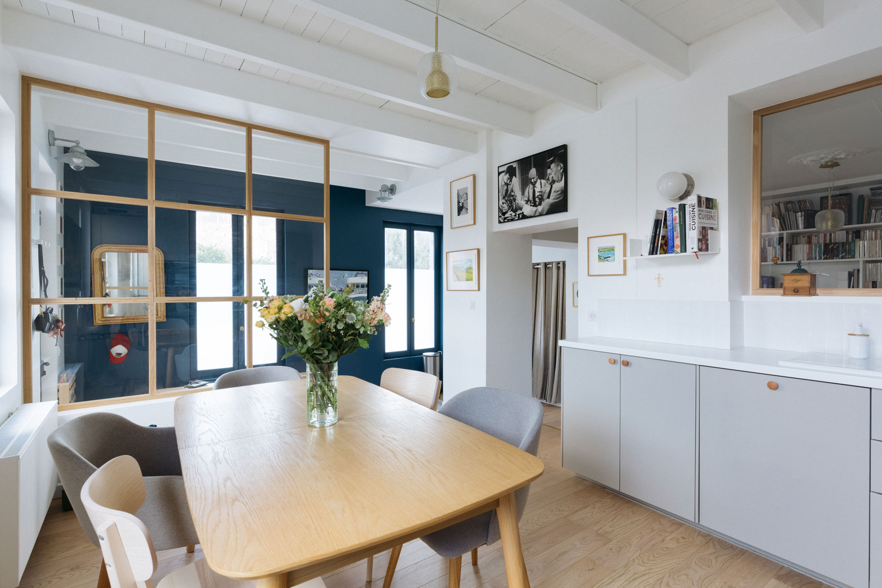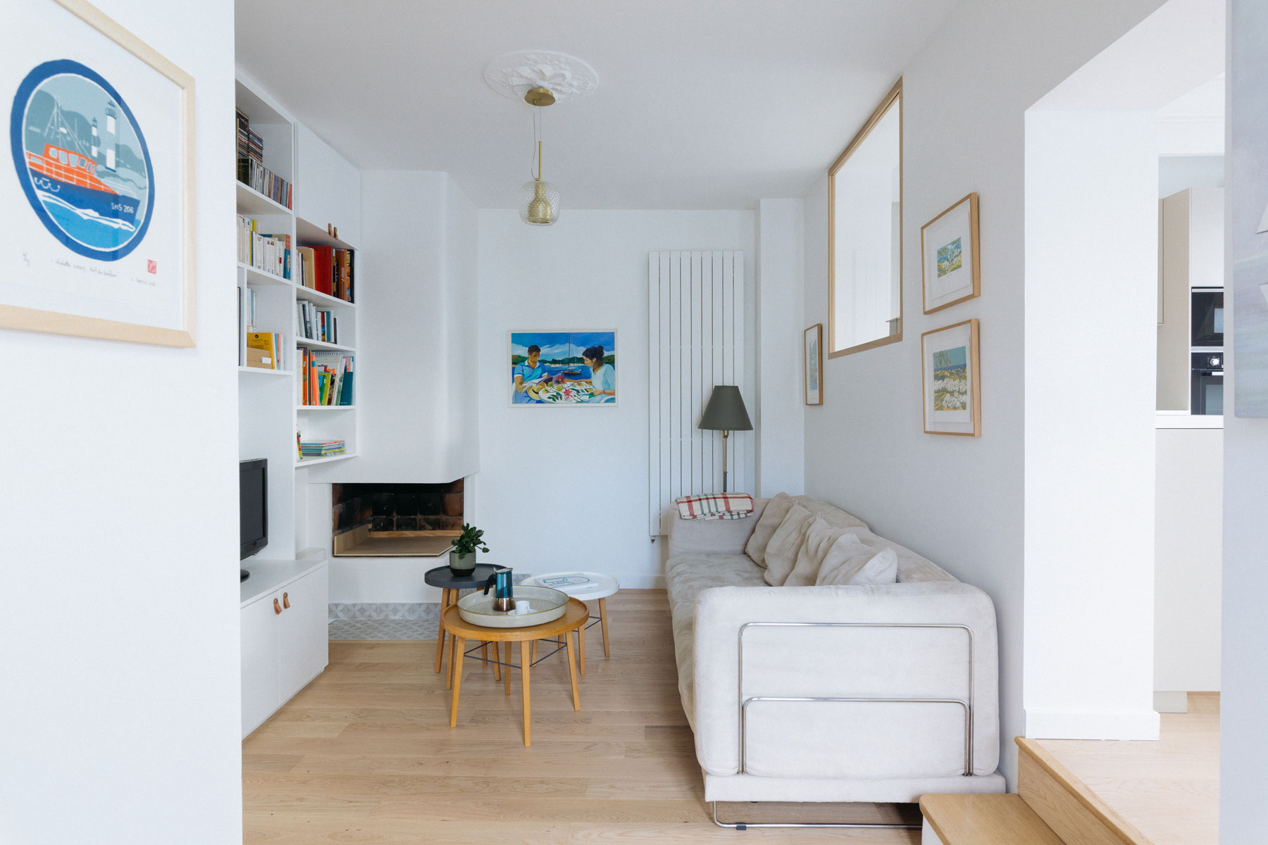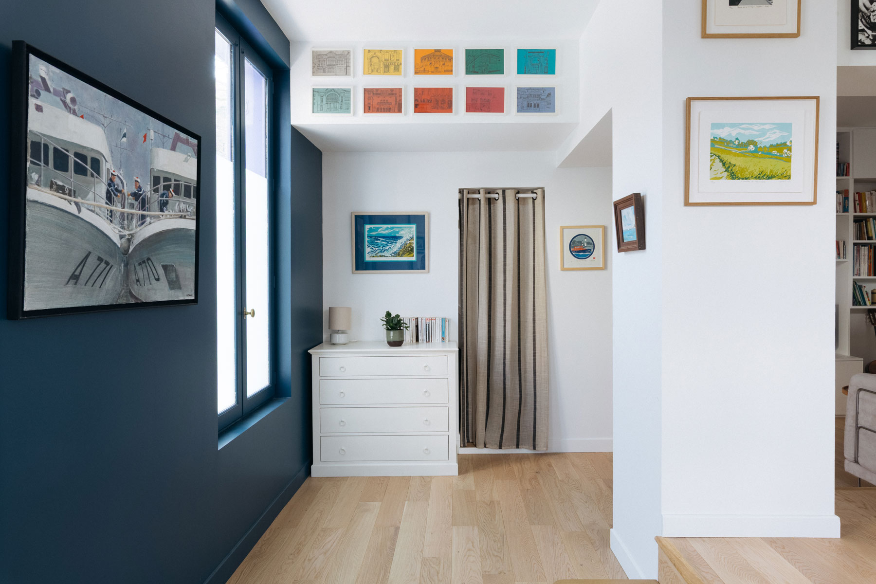 A deux pas de La Défense, cette maison aux allures de villa balnéaire a été métamorphosée pour accueillir une famille de 4 personnes. Au RDC, l’ascenseur existant a été supprimé ; une entrée, une cuisine dinatoire et un séjour cosy ont été créés. Au R+1, les volumes ont été intégralement revus pour créer 2 chambres d’enfants, une petite chambre d’amis et une salle d’eau. Au R+2, une suite parentale avec salle de bains a été aménagée dans les volumes existants. Côté déco, la carte de la maison de vacances les pieds dans l’eau a été jouée, respectant les envies de ses occupants.